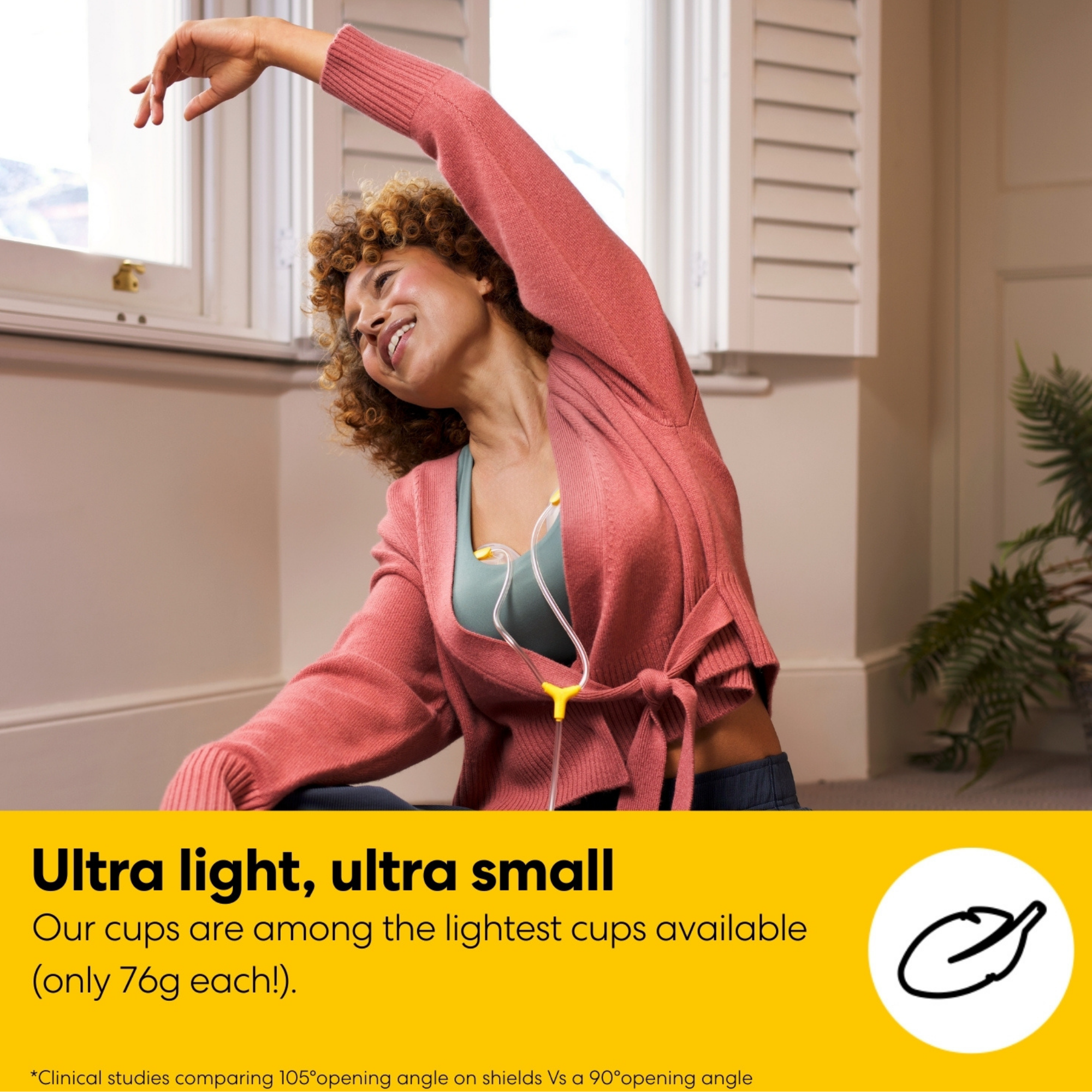 The Hands‑free Collection Cups feature a 105‑degree opening angle and an anatomic shape that helps optimise milk flow while reducing compression on the breast.